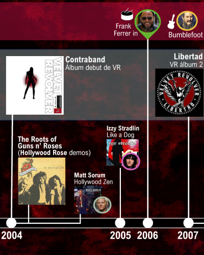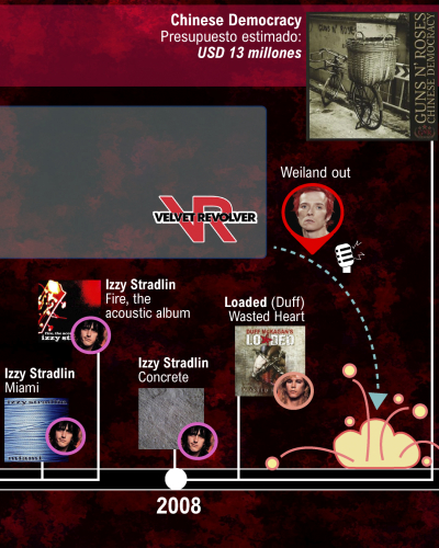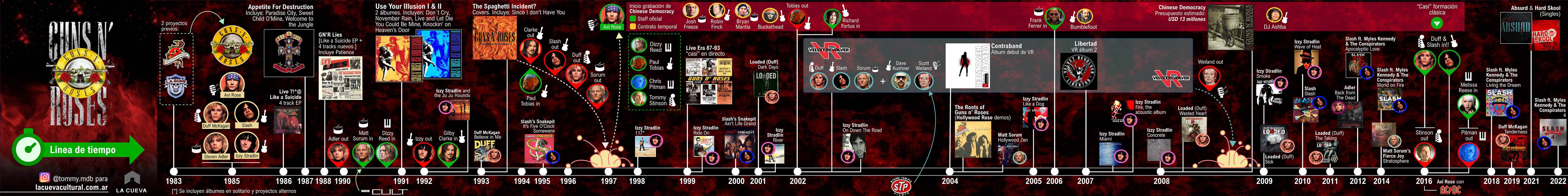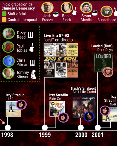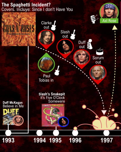 Tal como figura en este gráfico de línea de tiempo, resumiremos aquí la ajetreada historia de los Guns n’ Roses: desde su contundente éxito inicial hasta su decadencia; desde el creciente dominio de Axl Rose sobre la banda, hasta la rotación constante de personal y su actual “casi” retorno. También aparecerán otros proyectos alternativos a los Guns, como Velvet Revolver, Slash’s Snakepit, Loaded de Duff y la prolífica carrera en solitario de Izzy Stradlin, entre otros.