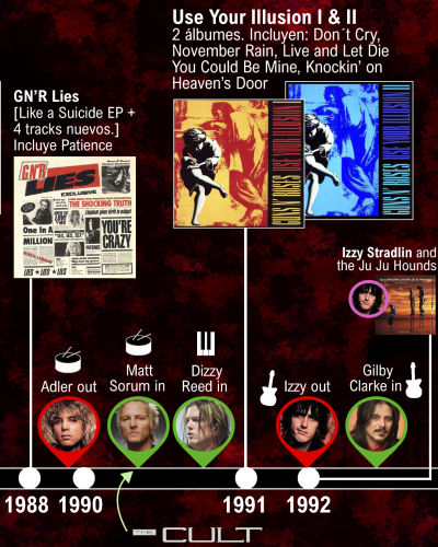 En 1990 fue incorporado a Guns n’ Roses el baterista Matt Sorum proveniente de The Cult. También se les sumó el tecladista Dizzy Reed. Esta formación grabó los pretenciosos (y exitosos) Use Your Illusion I y Use Your Illusion II, lanzados en simultáneo en noviembre de 1991.