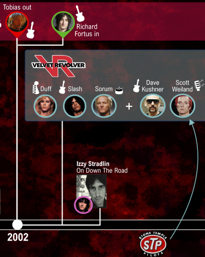 Velvet Revolver: quizás el proyecto más exitoso que haya surgido de la era post-Guns n’ Roses. Esta banda estuvo formada por Slash, Duff McKagan y Matt Sorum, con la participación del guitarrista Dave Kushner y el cantante de Stone Temple Pilots, Scott Weiland. Velvet Revolver lanzó dos exitosos álbumes: Contraband en 2002 y Libertad en 2007, para disolverse un año más tarde debido a la salida de Weiland.