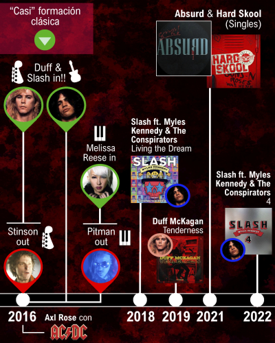 En 2016 se dio lo inesperado: Slash y Duff McKagan volvieron a Guns n’ Roses, reconfigurando así la mayoría de la formación clásica de la banda. Además, Guns n’ Roses incorporó a Melissa Reese como segunda tecladista y reemplazo de Chris Pitman.