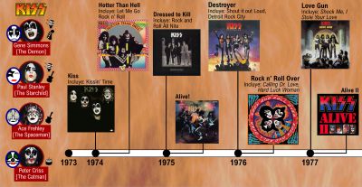 Entre 1973 y 1983 todos los miembros de Kiss utilizaron maquillaje para sus actuaciones y apariciones en público. Durante esta época fue que la banda lanzó sus canciones más exitosas, como Shout it Out Loud, Rock and Roll All Nite y I was Made for Loving You.