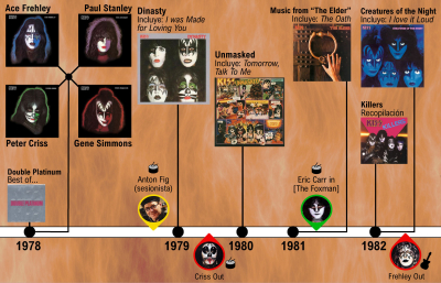 El primer miembro en ser reemplazado en la agrupación fue el baterista Peter Criss, en 1979. Tanto en el disco de ese año, Dinasty, como en el subsiguiente de 1980, Unmasked, el baterista de sesión Anton Fig fue contratado para grabar. Aunque Criss permanecía oficialmente en el grupo, no participó de las grabaciones. Tras su desvinculación definitiva, su reemplazo oficial fue Eric Carr, quien asumió el personaje de El Hombre Zorro (The Foxman)