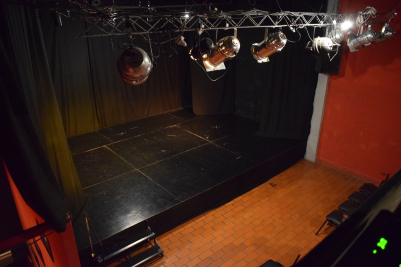 La disposición del espacio escénico y del espectador se encuentra estructurado a la italiana con un escenario de 6 mts. de boca, 4,20 mts. de profundidad y 50 cm de alto, de piso fenólico pintado de color negro. La caja escénica es negra, con 4 patas por hombro de color negro de 1,60 mts. de ancho por 4,50 mts de alto.